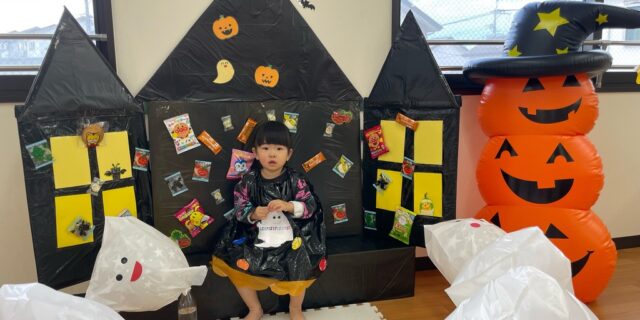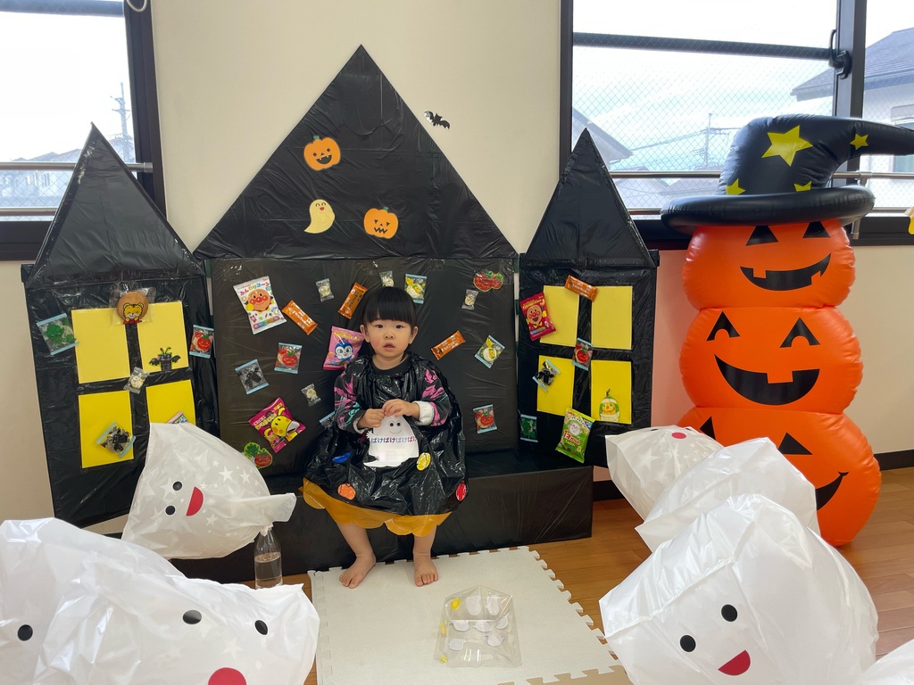 10月31日にハロウィンパーティーをしました! お家の扉を開けると沢山のお菓子が! とても嬉しそうに袋の中に入れていました♪
