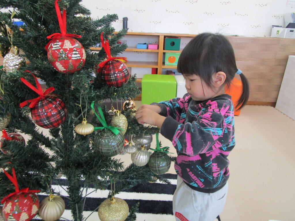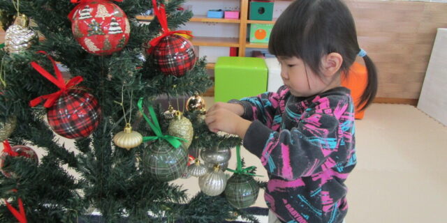 12月に入りピノッキオ名島でも クリスマスツリーの飾り付けをしました♪ キラキラの飾りを握りしめて 可愛く飾り付けできましたよ☆